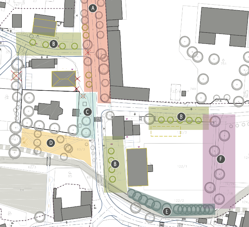 První oblastí je náves a přilehlé okolí včetně parku okolo kostela a obecního rybníku, areálu školy a sokolovny včetně venkovních sportovních ploch. Další oblastí je původní náves, dnes hlavní ulice ve směru na Rakovník. Významným územím pro komunitní život obce je areál fotbalového hřiště s okolím, tato oblast zahrnuje také areál restaurace u Barona. Poslední řešenou oblastí je severní okraj obce v ÚPD vymezený pro výrobu a průmysl, kam by bylo vhodné umístit obecní sběrný dvůr.