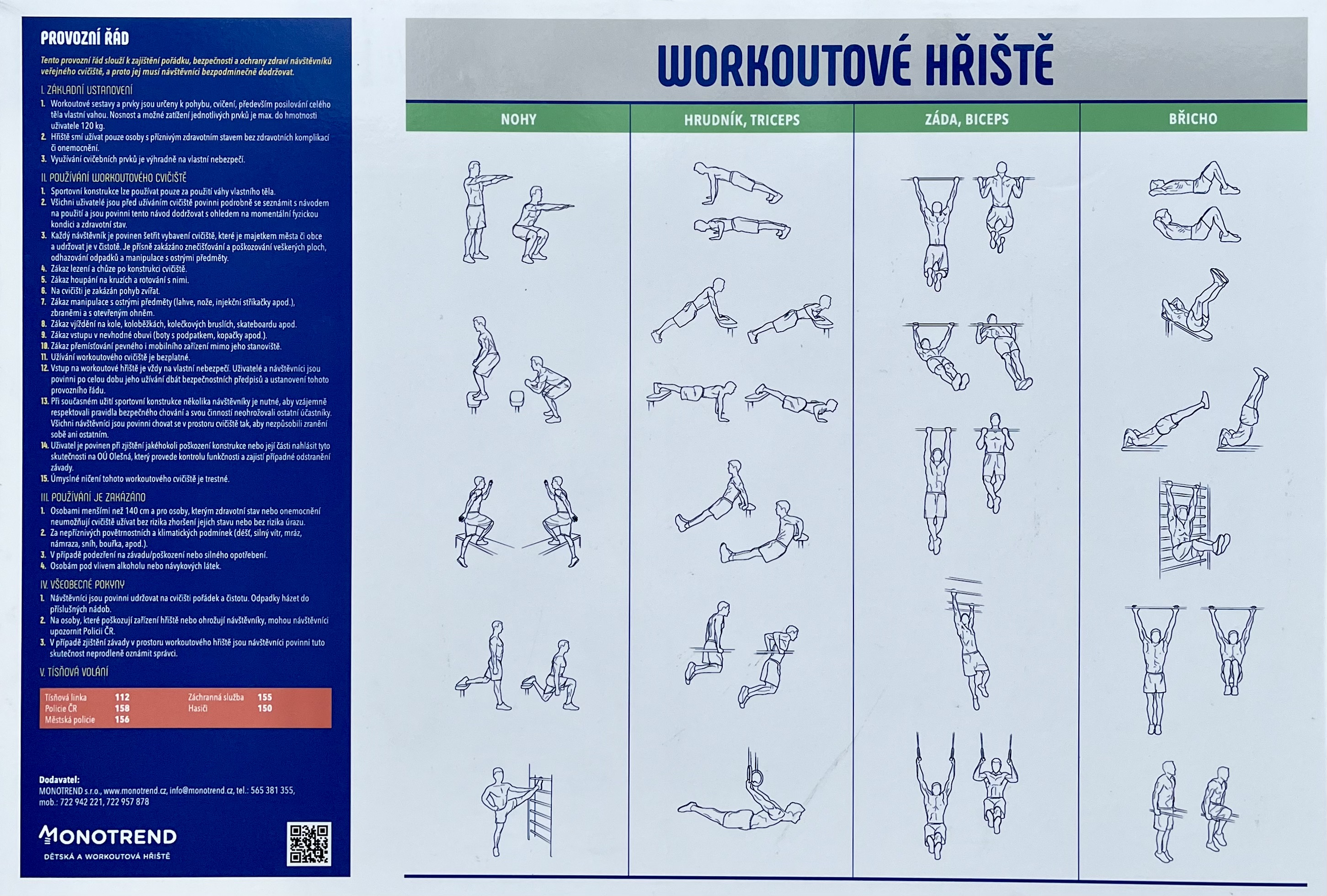 Celokovová workoutová sestava Monotrend obsahuje snad všechny základní prvky, na kterých si poskládá cvičení jak úplný začátečník, tak zkušený borec. Nosná konstrukce je tvořena kruhovým profilem o rozměru 40 mm, která je vyrobena z konstrukční oceli. Konstrukce je opatřena zinkovým základem a následně vypalovanou barvou komaxit v odstínu RAL.